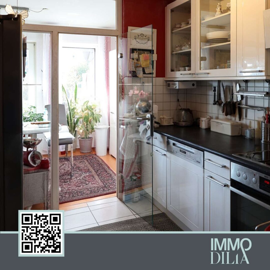 Die Küche ist sowohl vom Flur als auch vom Wohnzimmer aus zugänglich, was kurze Wege und eine besonders alltagstaugliche Nutzung ermöglicht. Sie bietet ausreichend Platz und eine funktionale Aufteilung für genussvolles Kochen im Alltag wie auch besonderen Anlässen.